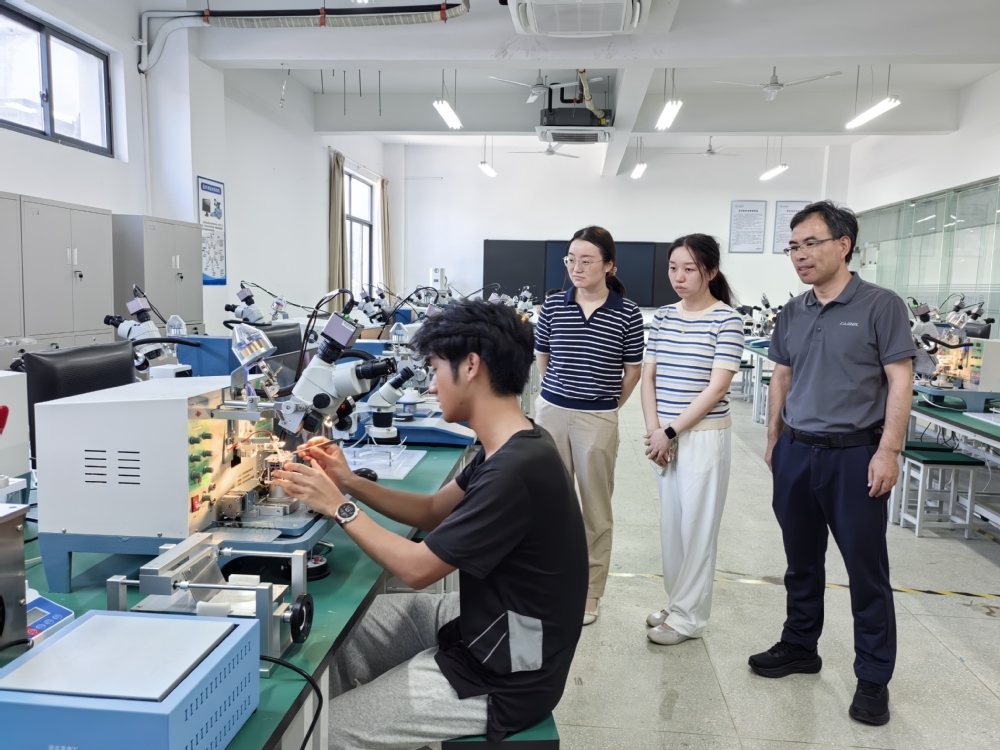 陳嬌一行重點(diǎn)參觀了電子信息學(xué)院黃光實(shí)訓(xùn)室和集成電路相關(guān)實(shí)訓(xùn)室。電子信息學(xué)院副院長徐海峰詳細(xì)介紹了相關(guān)實(shí)訓(xùn)室的功能定位、先進(jìn)設(shè)備配置及其在教學(xué)中的應(yīng)用場景,并著重闡述了實(shí)訓(xùn)室在支撐集成電路產(chǎn)業(yè)實(shí)踐教學(xué)、培養(yǎng)學(xué)生核心技能方面發(fā)揮的關(guān)鍵作用,以及教學(xué)資源與產(chǎn)業(yè)技術(shù)前沿的對接及應(yīng)用情況。